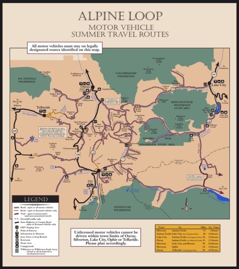 Note: Technically the road through red mountain pass is paved (part of the million dollar highway), however the unpaved OHV trails and services roads require high clearance 4×4 vehicles.